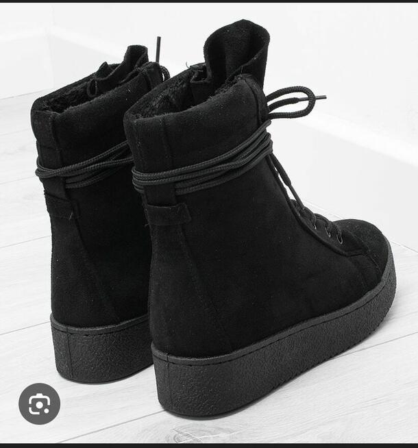 Botki marki Stradivarius w kolorze czarnym z zamszowej tkaniny, używane. Niewielkiej ślady użytkowania, widoczne na ...
